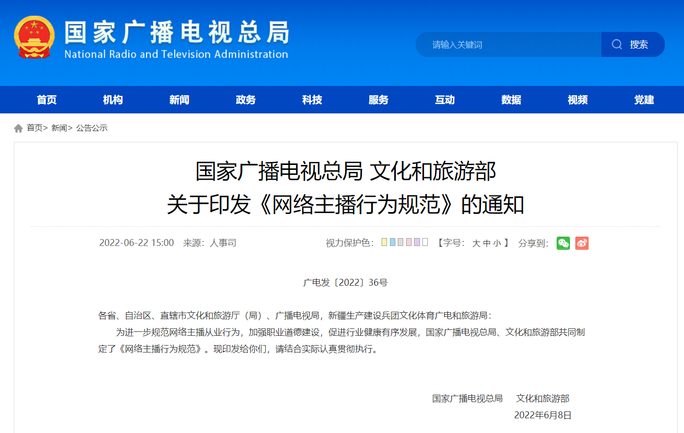 為加強規范管理,國家廣播電視總局在廣泛開(kāi)展專(zhuān)題調研的基礎上,會(huì )同文化和旅游部共同起草形成了《網(wǎng)絡(luò )主播行為規范》。